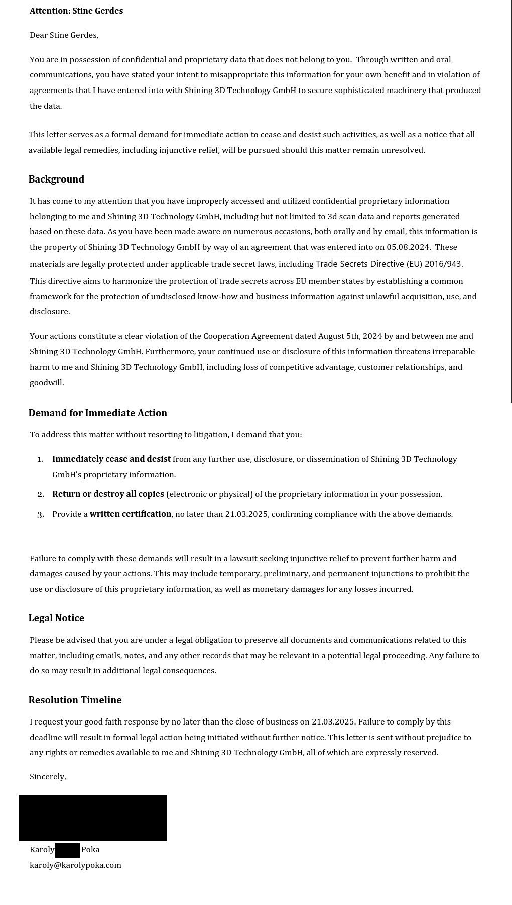 Karoly attempted to force me into submission by threatening a lawsuit.